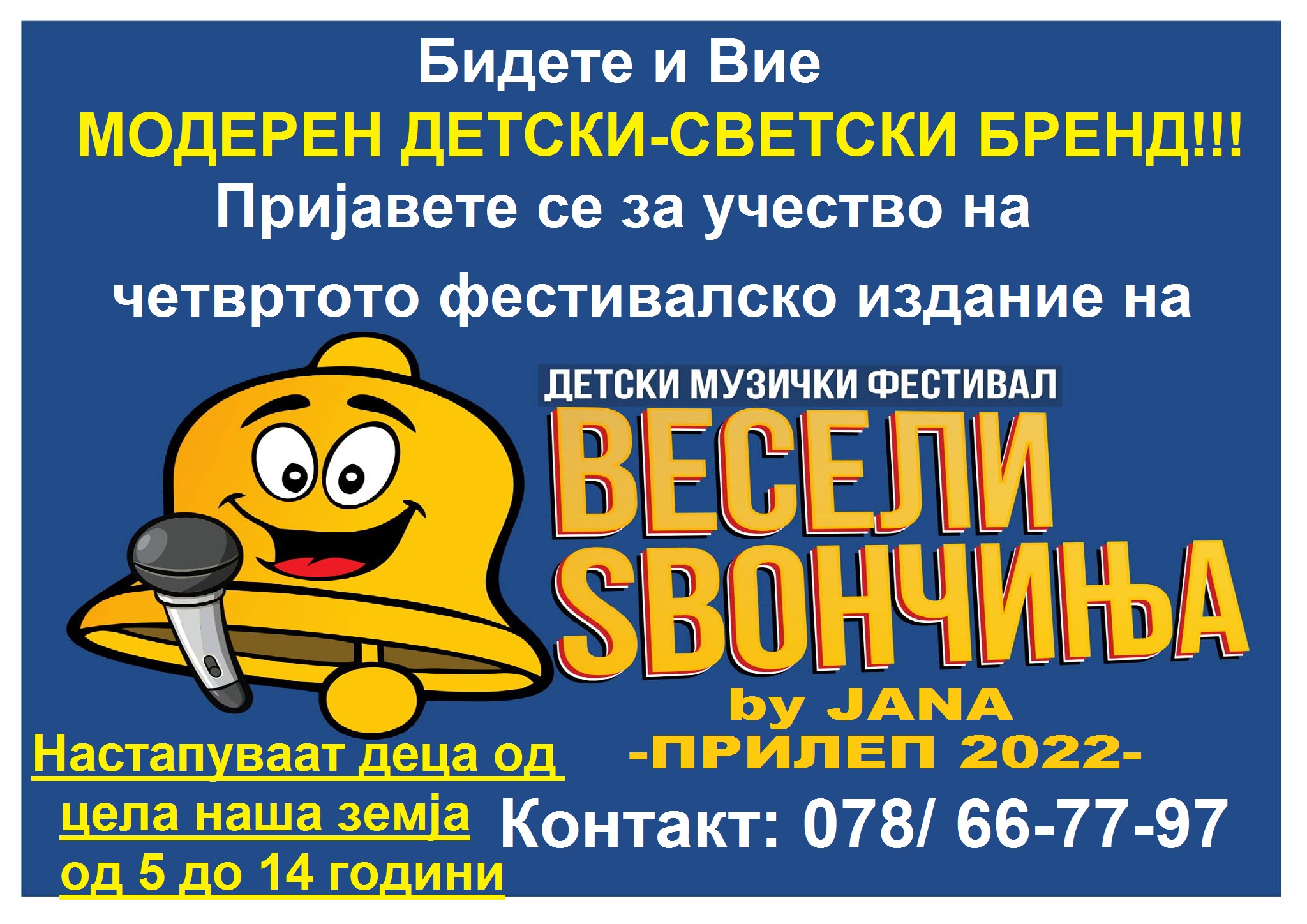Голем интерес за пријавување за учество на следното издание на прилепскиот фестивал “Весели Ѕвончиња by JANA”-Прилеп 2022. Најголемиот дел од пријавените се од Прилеп, меѓутоа сега за сега има и неколку пријавени кандидати за учество и од другите градови за детскиот и тинејџерскот музички блок на прилепскиот фестивал “Весели Ѕвончиња by JANA”-Прилеп 2022. Доколку имате и Вие од 5 до 14 години не ја пропуштајте оваа екстра можност и пријавете се за учество на четвртото издание на моментално најактуелниот детски фестивал “Весели Ѕвончиња by JANA”-Прилеп 2022. Колку за потсетување, трето издание на фестивалот помина доста успешно во Прилеп, и истото се одржа на камената бина, а за да сцената на камената бина изгледаше фестивалски, се погрижија професионалците од прилепската цвеќарница “Арт”. Токму на ова последно фестивалско издание пред повеќе од 1000 присутни кои уживаа во песните од најновото фестивалско издание за МОДЕРЕН-ДЕТСКИ-СВЕТСКИ-БРЕНД беше прогласен детскиот музички фестивал “Весели Ѕвончиња by JANA” Публиката во Прилеп имаше можност да слушне навистина убави, екстра модерни нови детски и тинејџерски песни со вистински модерен звук, кои можат рамо до рамо да се носат со големите светски музички хитови. Ова е само потврда дека освен за најмладите, Детскиот Музички Фестивал “Весели Ѕвончиња by ЈАNA” како моментално најмодерен детски музички фестивал покрај за најмладите, остава простор и за тинејџерите. Како резултат на светскиот квалитет на песните, од неделата Детскиот Музички Фестивал “Весели Ѕвончиња by ЈАNA” се здоби со титула “МОДЕРЕН-ДЕТСКИ-СВЕТСКИ-БРЕНД”, бренд кој што веќе е препознатлив на нашето ѕвездено музичко небо ширум цела наша земја, а и надвор од неа. Доколку имате од 5 до 15 години и сакате и Вие да бидете дел од детскиот или пак дел од тинејџерскиот музички блок од следното најново спектакуларно фестивалско издание кое ќе се одржи кон крајот на мај 2022 година, Вашите родители ќе можат да Ве пријават на Facebоok профилот на Гоце Илиески-Балада, на Facebоok профилот на Весели Ѕвончиња, или пак на 078/66-77-97. Бидете детски музички ѕвезди, бидете АС, бидете главни во Вашето Школо -во Вашиот Клас, и пријавете се за учество за следното фестивалско издание на Весели Ѕвончиња by JANA,и стекнете се со Диплома за МОДЕРЕН-ДЕТСКИ-СВЕТСКИ-БРЕНД!!!