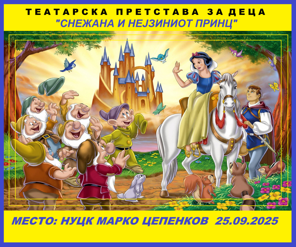 После одиграните претстави во повеќето градови во Македонија (и тоа по неколку пати во еден град по барање на публиката), овој пат, честа ја имаат најмладите прилепчанчиња кои на 25.09.2025 година ќе ја проследат претставата за Снежана, принцот и џуџињата, и вистински ќе уживаат во оваа детска театарска претстава.