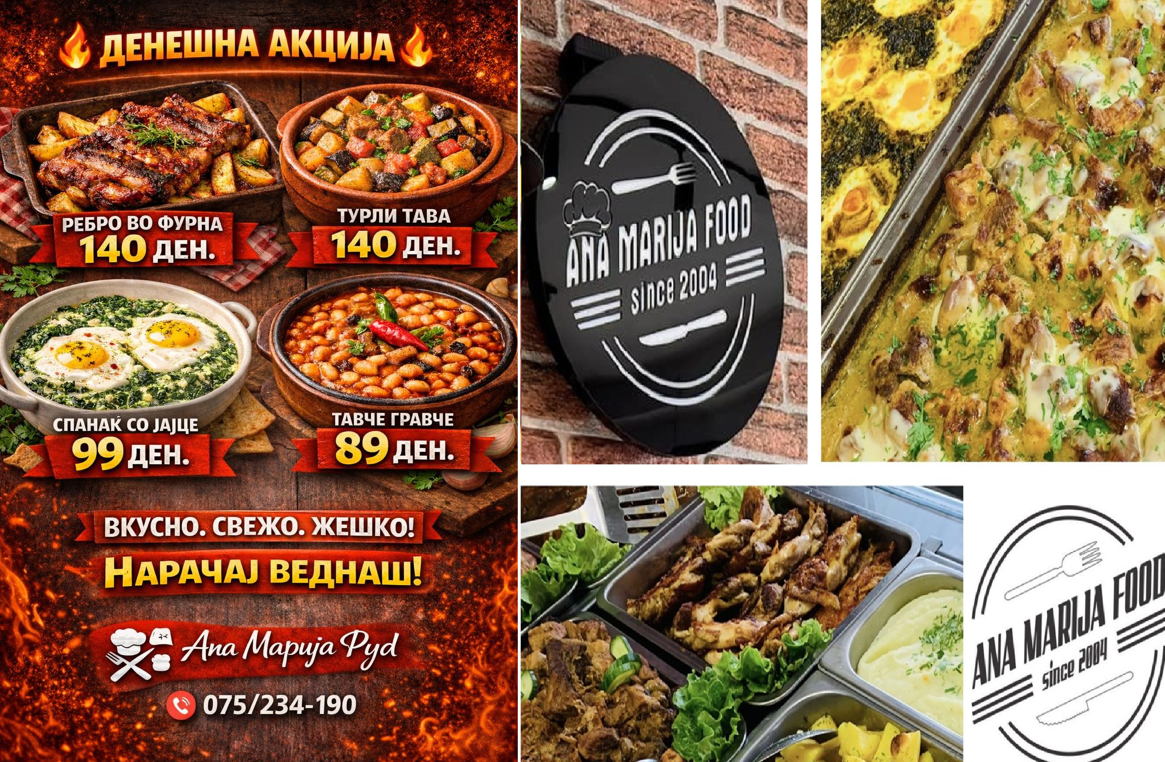 Доказ за квалитетот, се големиот број на потрошувачи кои секојдневно изборот за јадење и вкусен оброк за дома, го доверуваат на Ана-Марија Фуд-најдобрата кетеринг услуга во Прилеп и пошироко!!! И денеска Ана-Марија Фуд со гооолема акција на вкусни – готвени јадења, при што денеска вкусно тавче гравче чини само 89 денари, спанаќ со јајца-99 денари, а реброто во фурна и традиционата Турли тава се по цена од само 149 денари!! Погледнете во прилог што се има денеска на менито во Ана Марија – Фуд: