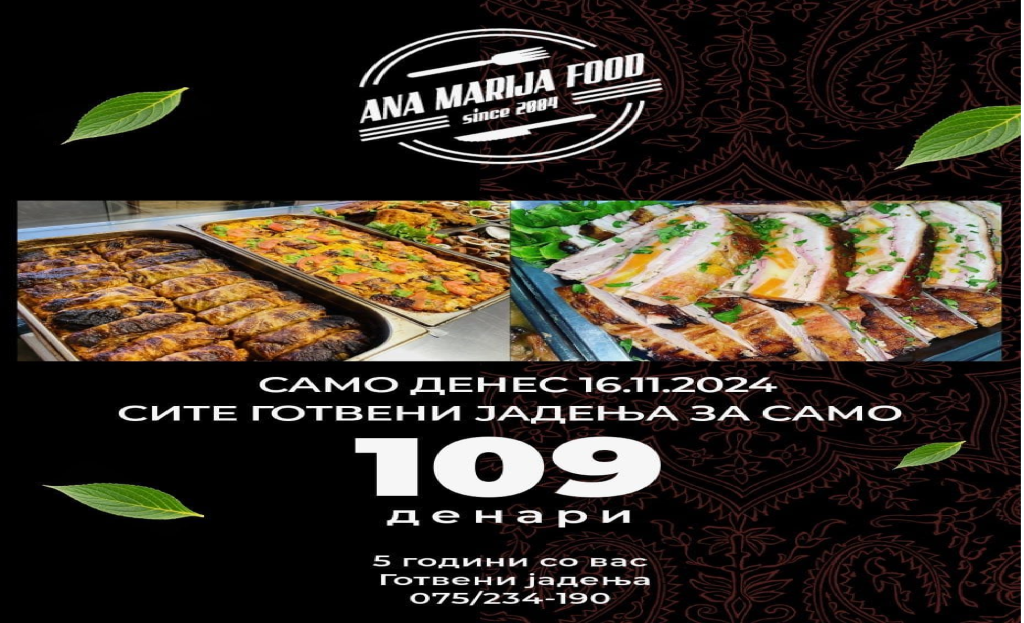 Денес, продавницата за готвена храна “Ana Marija Fud” слави 5 години успешно постоење. Имено, тимот на “Ana Marija Food”, упатува голема благодарност до своите потрошувачи за укажаната доверба, доверба без која “Ana Marija Food” немаше да биде она што е денес. Цели 5 години градот го има најдобриот вкус на храна кој што под “прва” ќе Ве освои, а токму заради нивниот докажан квалитет, “Aна Марија Фуд” и во иднина ќе постои! А денеска од “Aна Марија Фуд” за сите верни потрошувачи, следува одличен роденденски подарок, при што само денеска сите готвени јадења ќе бидат по симболична цена од само 109 денари!
