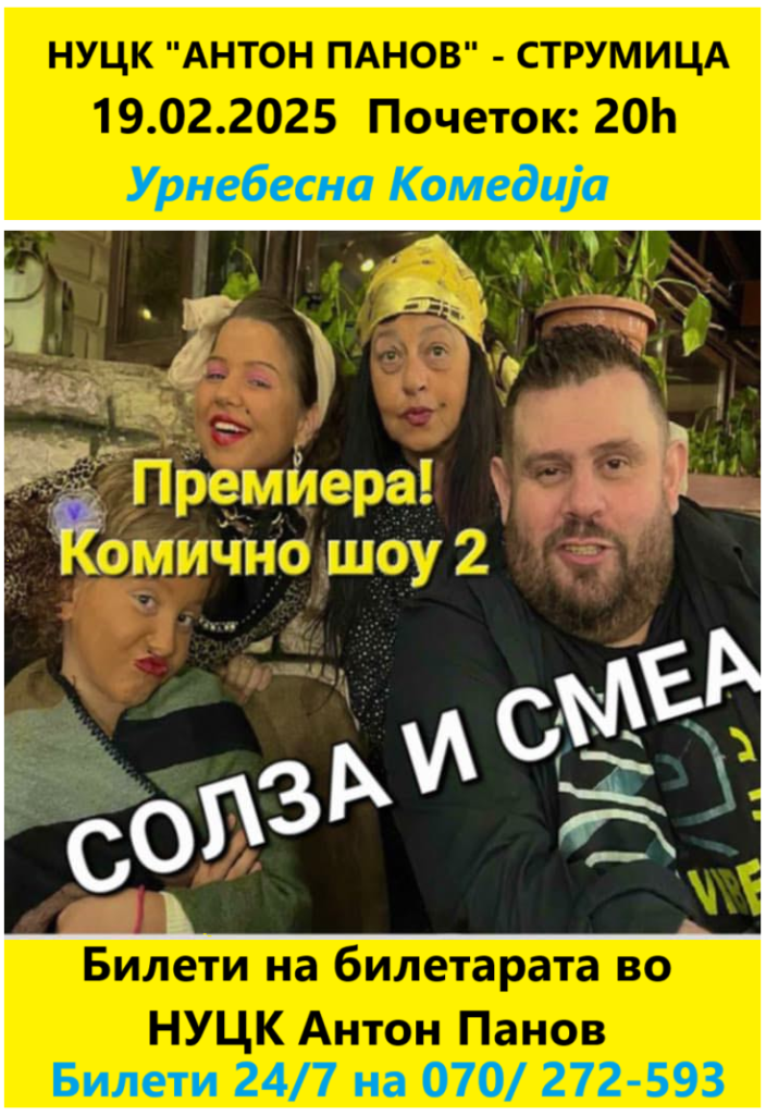 “Солза и смеа” доаѓаат во Струмица со најновото комично шоу кое носи наслов “Аџанак -Баџанак”, шоу кое ПРЕМИЕРНО ќе биде изведено во овој град. Овој месец популарните тв ликови од “Солза и смеа” ја започнаа својата голема турнеја во над 10 градови во Македонија – и тоа во зголемен, проширен состав со нивната најнова урнебесна комедија, каде ги полнат салите до последното место! Во Струмица доаѓаат на 19.02.2025 година (СРЕДА) , а комичното шоу е закажано за во 20h во НУЦК “Антон Панов”, сала која исто како и минатите години, ќе биде претесна за да ги собере сите струмичани кои ќе уживаат во смеата на овие добро познати комични ликови.