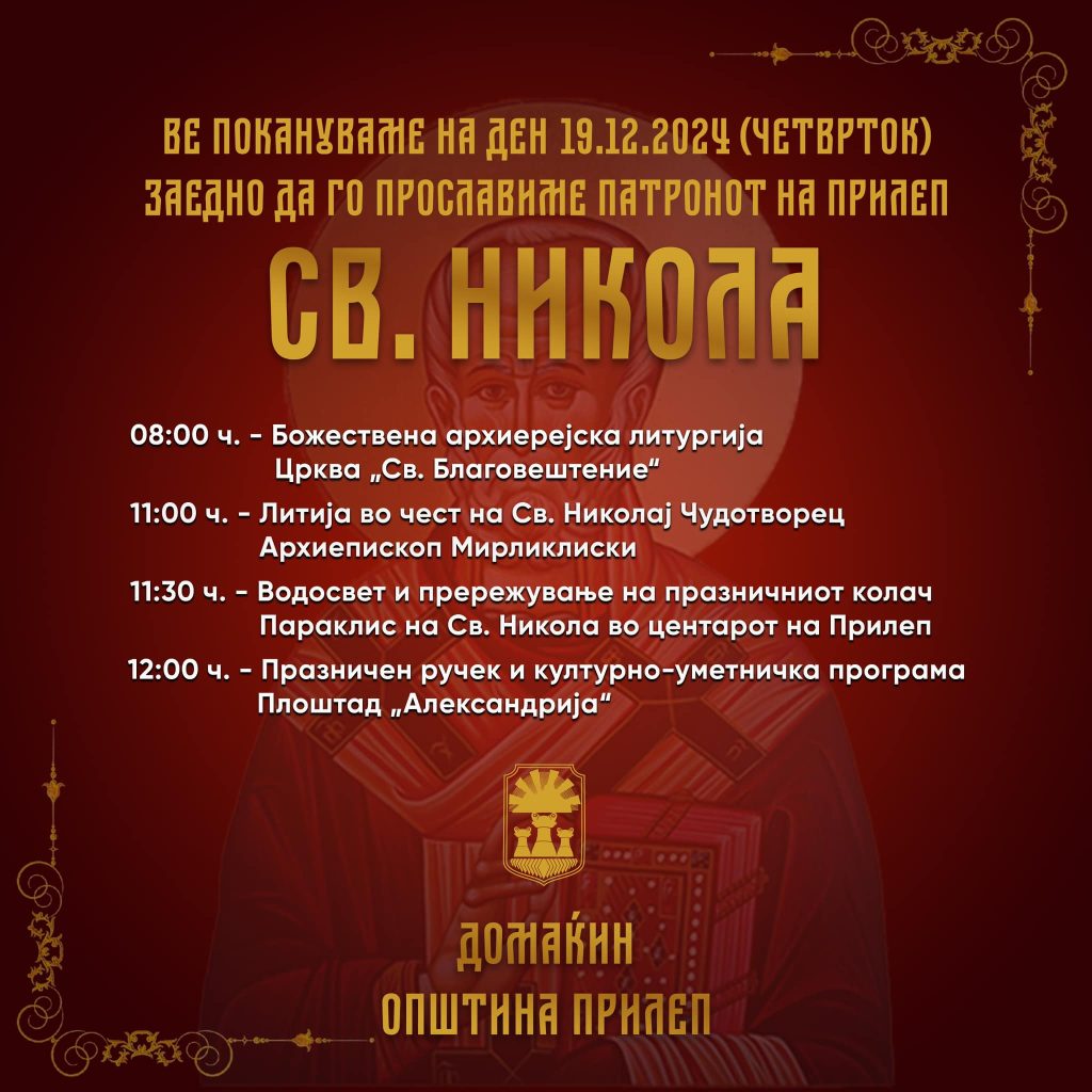 Со гордост и радост ве покануваме да присуствувате на прославата по повод градската слава Св. Никола, која ќе се одржи во четврток, 19.12.2024 година, а на која домаќин е токму Локалната самоуправа на Општина Прилеп!