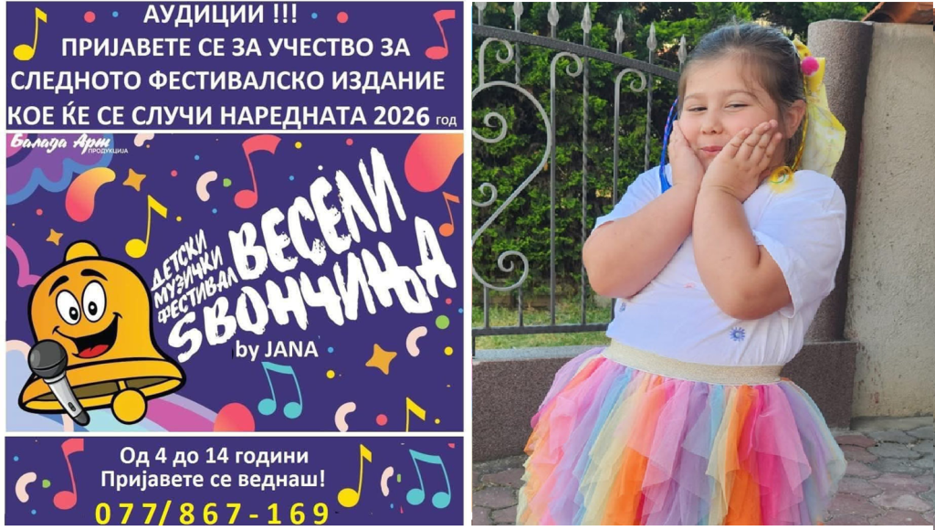 Ова е само потврда дека Детскиот Музички Фестивал “Весели Ѕвончиња by ЈАNA” како моментално најмодерен детски музички фестивал во земјава остава значајна трага во ѕвезденото музичко небо. Како резултат на светскиот квалитет на песните, овој фестивал се здоби со титула “МОДЕРЕН-ДЕТСКИ-СВЕТСКИ-БРЕНД”, бренд кој што веќе е препознатлив на нашето ѕвездено музичко небо ширум цела наша земја, а и надвор од неа. Доколку имате од 4 до 15 години и сакате и Вие да бидете дел од детскиот или пак дел од тинејџерскиот музички блок од следното најново спектакуларно фестивалско издание на детскиот музички фестивал “”Весели Ѕвончиња by JANA”, Вашите родители ќе можат да Ве пријават на Facebоok профилот на Гоце Илиески-Балада, на Facebоok профилот на Весели Ѕвончиња, или пак на 077/867-169 – ОСТАНАТО Е САМО УШТЕ ЕДНО СЛОБОДНО МЕСТО!!