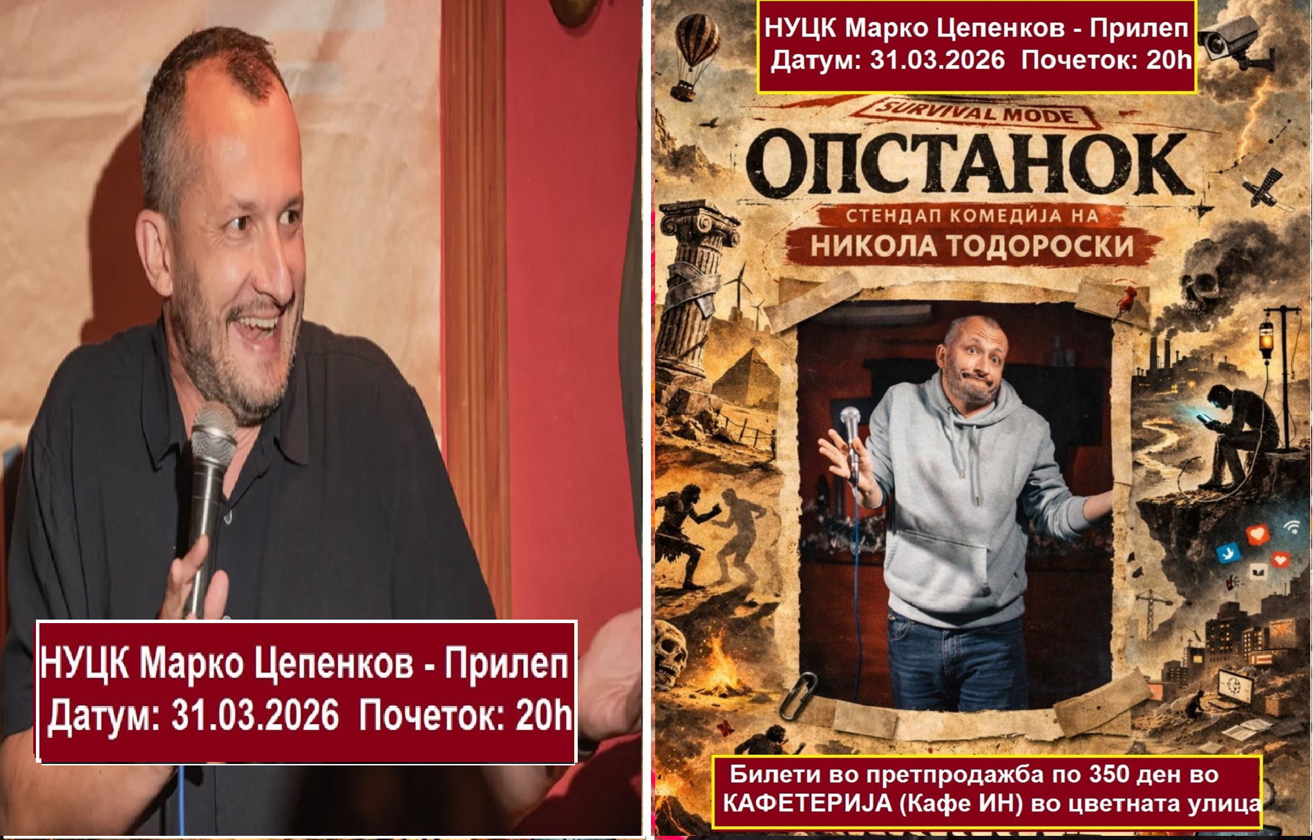 Побрзајте – набавете си билети бидејќи веќе ги снемува! Премиера на ОПСТАНОК – најновото стендап комично шоу на Никола Тодороски, кое премиерно ќе биде изведено во Прилеп и Битола. Незаменливиот Никола Тодороски доаѓа во Прилеп на 31.03.2026 година во НУЦК Марко Цепенков со почеток во 20 часот. Билети за стендап комедијата на Никола Тодороски во Прилеп може да си набавите во КАФЕТЕРИЈА во цветната улица во Прилеп.