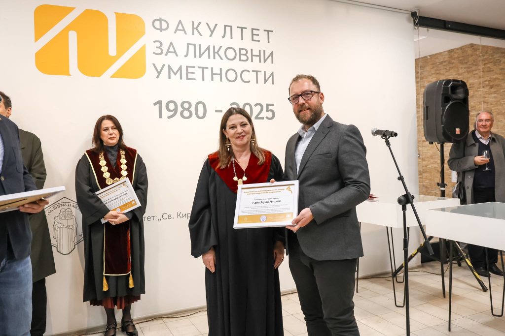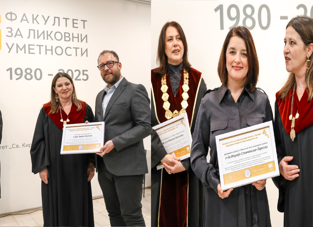 На изложбата која ја отворија д-р Биљана Ангелова, ректор на Универзитет „Св. Кирил и Методиј“ во Скопје и деканот на Факултетот за ликовни уметности, проф. д-р Славица Јанешлиева заедно со министерката за образование и наука, Весна Јаневска и државниот секретар во Министерството за култура и туризам, Марија Станчевска-Ѓоргова добивме благодарници за соработката, поддршката и придонесот во развојот и унапредувањето на уметноста и образованието.