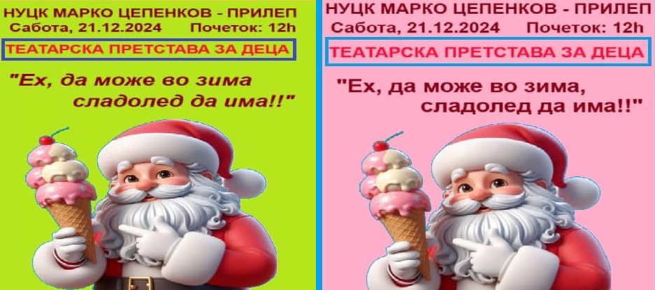 По тој повод, специјално само за најмладата публика во Прилеп, на 21.12.2024 (сабота) со почеток во 12 часот во големата сала во НУЦК Марко Цепенков, погледнете ја ПРЕМИЕРАТА на театарската претстава -ДЕТСКАТА НОВОГОДИШНА БАЈКА СО ДЕДО МРАЗ И НЕГОВИТЕ ПРИЈАТЕЛИ која носи наслов “Ех да може во зима – сладолед да има”, која со сигурност ќе создаде волшебни, новогодишни спомени во секое детско срце.