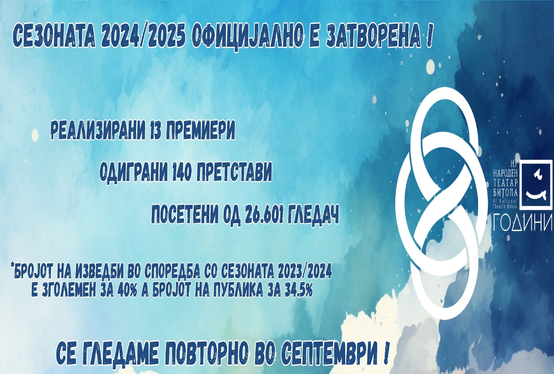 Како што соопштуваат од битолскиот народен театар, театарската сезона 2024/2025 година официјално е завршена. Меѓутоа она што е охрабрувачки е самиот факт дека бројот на театарски изведби во оваа сезона во споредба со минатата, е зголемен за дури 40%, а бројот на публика е зголемен за вкупно 34,5%.