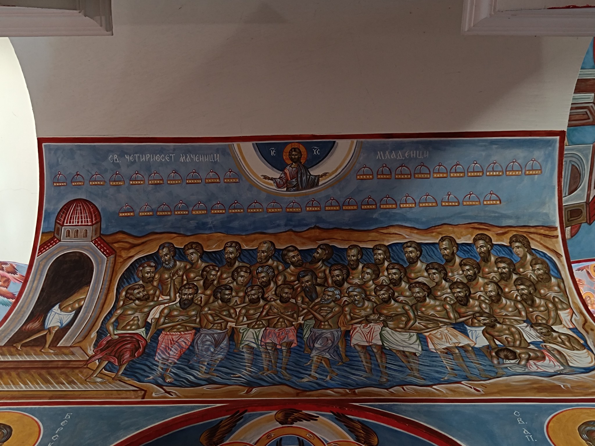 “Со голема радост ве известуваме дека е завршена фреската на Светите 40 севастиски маченици – МЛАДЕНЦИ, сместена во јужниот дел на нашиот храм. Овој светол момент на духовно и уметничко збогатување на светиот храм го должиме на дарежливоста на еден благочестив донатор, кој со својата несебична поддршка ја овозможи реализацијата на ова свето дело. И не само на ова дело! Овој донатор овозможи реализација и на неколку фрески претходно а ќе биде донатор и на композицијата на Преображението Господово.