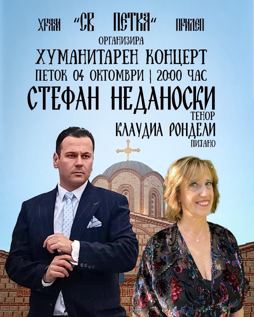 Со голема радост ве известуваме дека на 4 октомври (петок), со почеток во 20:00 часот, во храмот „Св. Петка“ ќе се одржи уште еден хуманитарен концерт од серијата на културно-уметнички настани кои имаат за цел да го подигнат духовно-уметничкото и културно ниво во нашиот град. Овој пат, прилепската публика ќе има извонредна можност да ужива во настапот на нашиот прилепски тенор Стефан Неданоски, кој ќе биде придружуван од реномираната италијанска пијанистка, професорката Клаудија Рондели.