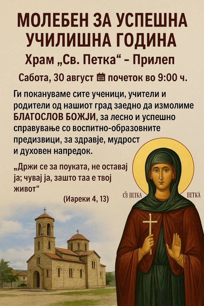 Во молитва ќе Го замолиме Бога да им подари на сите ученици здравје, мудрост, трпение и љубов кон знаењето, а на нивните учители сила, разбирање и просветленост за да ја пренесуваат својата мисија со љубов и посветеност – информираат од црквата св.Петка.