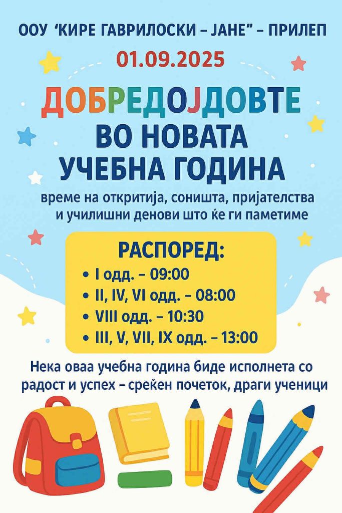 Во ООУ “Кире Гаврилоски -Јане” се создадени сите неопходни услови за успешен почеток и тек на наставата во новата учебна година, која започнува овој понеделник, 01.09.2025 година. Во пресрет на новата учебна година, ООУ “Кире Гаврилоски -Јане” излезе со важно известување до нивните ученици во однос на нивниот распоред: